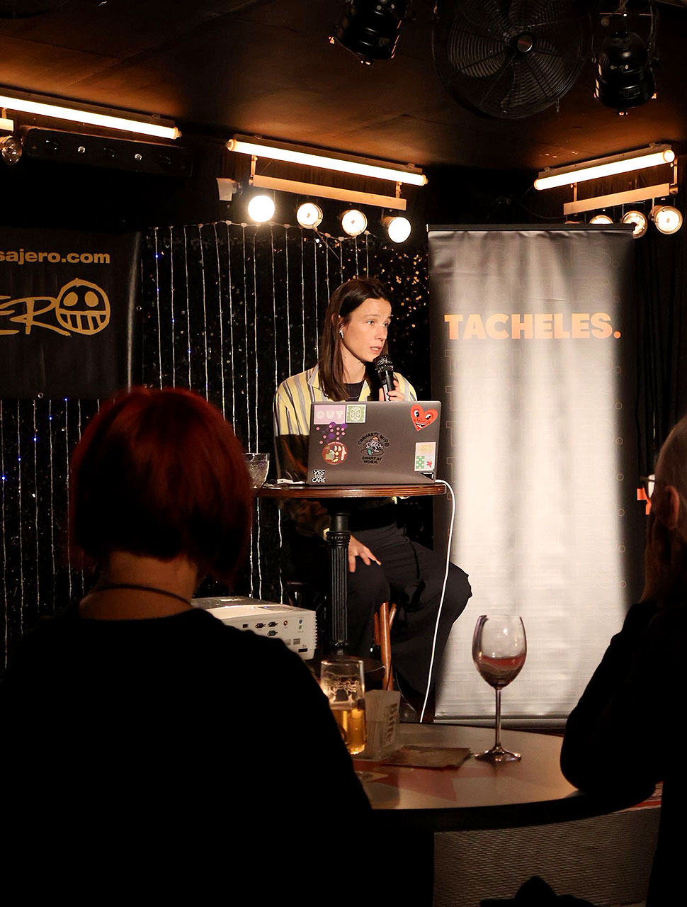Danach angeregte Debatte mit Hannah Brinkmann in vielen, kleinen Gruppen an Stehtischen im Saal des Messajero .