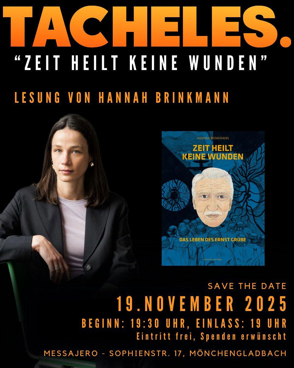 Lesung mit Präsentation der Graphic Novel „Zeit heilt keine Wunden„ über das Leben des Zeitzeugen Ernst Grube, der als Kind nach Theresienstadt deportieret wurde, nach den Krieg wegen politischer Aktivität verurteilt wurde vom Richter Kurt Weber, vorher Staatsanwalt unter den Nazis .