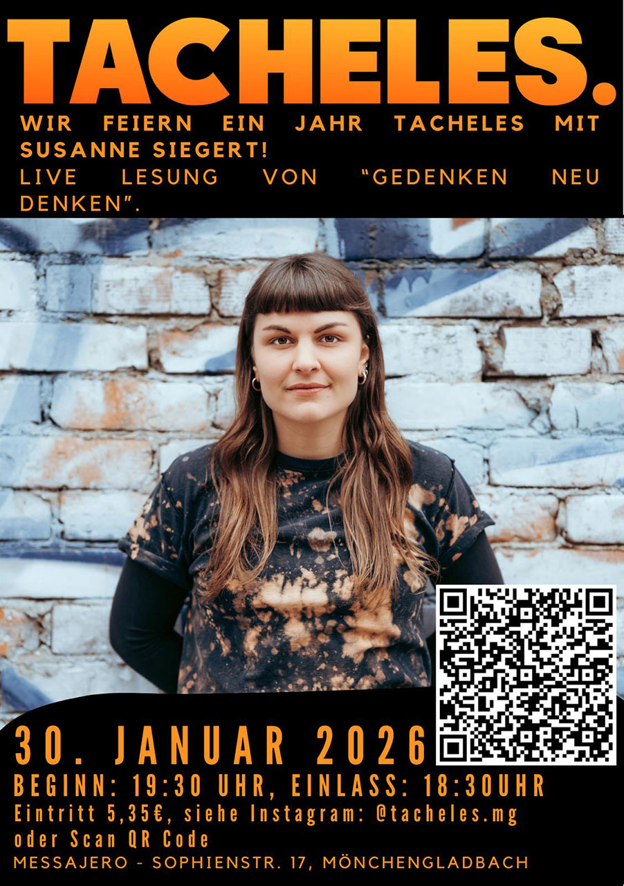 Am 30. Januar 2026 kommt die Autorin, Content Creatorin und Gewinnerin des Margot Friedländer Preises 2025, Susanne Siegert, für eine Lesung Ihres Buches „Gedenken neu denken: Wie sich unser Erinnern an den Holocaust verändern muss“ nach Mönchengladbach. Die Lesung beginnt um 19.30 Uhr im Messajero auf der Sophienstraße 17.